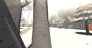 "Lily has created a whimsical winter village filled with elves and humans enjoying winter activities. Travel the path to explore the beautifully landscaped areas. While on the bridge, look out over the festively decorated houses, then stop by the roasted chestnut stand and put on some skates and enjoy the skate pond. Further down the path you can get a burger, pizza and some hot chocolate to warm you up at the Hot Chocolate Stand". ~EC&Olde